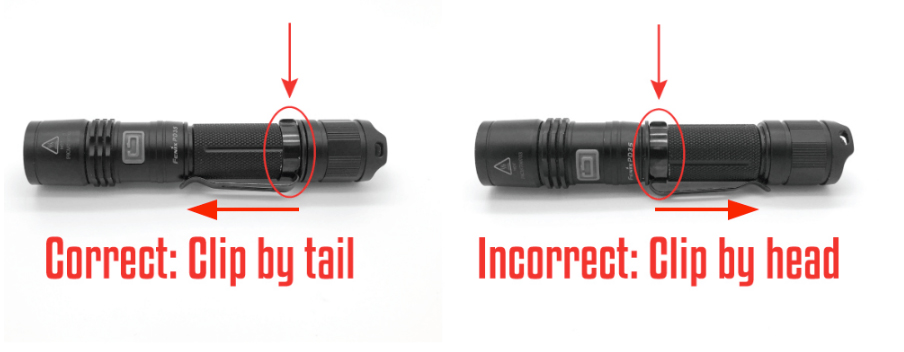 Esto se aplica a todas las luces que tienen un cabezal y una tapa trasera extraíbles. Por ejemplo, PD35 V3, UC35 V2, PD32 V2, etc. Si alguna vez desmonta su linterna para limpiarla y pone la tapa trasera y la cabeza al revés, la luz no se encenderá. Algunas personas también intercambian los extremos para que el clip de bolsillo quede en la dirección que ellos quieren. Eso hace que la luz ya no funcione. A continuación se muestra la ubicación correcta para la cabeza y la cola. Preste atención a la dirección a la que apunta el clip de bolsillo.