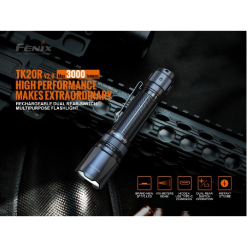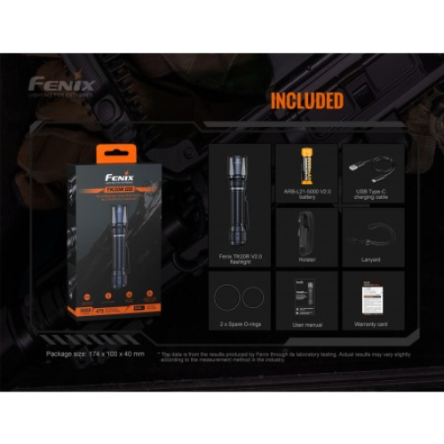 Su batería de iones de litio de alta capacidad de 5000 mAh que esta  incluida se puede cargar cómodamente a través del puerto USB tipo C de la linterna, lo que convierte a la linterna Fenix ​​TK20R V2.0 en su herramienta preferida para un rendimiento táctico duradero y de alta intensidad.