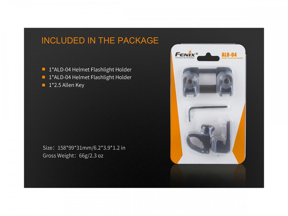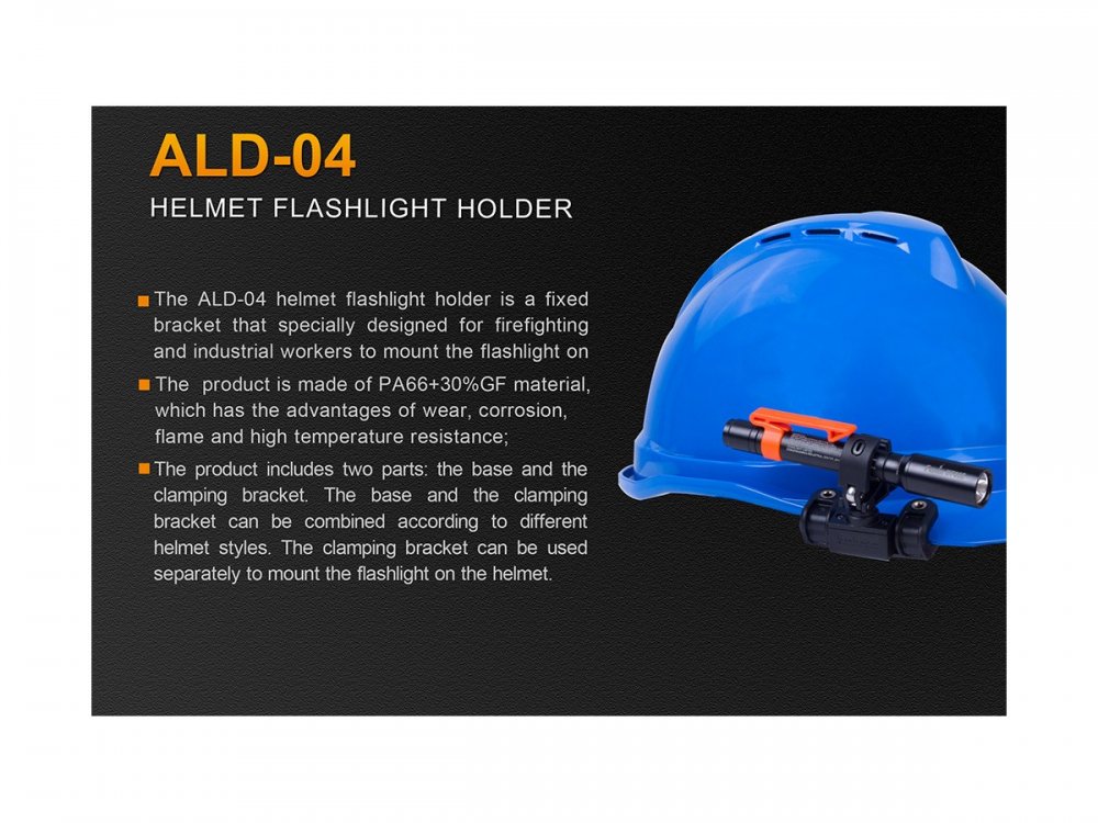 Este Kit de  montura Fenix  para casco ALD-04  ayuda a mantener sus manos libres y su linterna segura en su casco, consta de  dos partes fue diseñado específicamente para trabajadores industriales y cascos contra incendios.