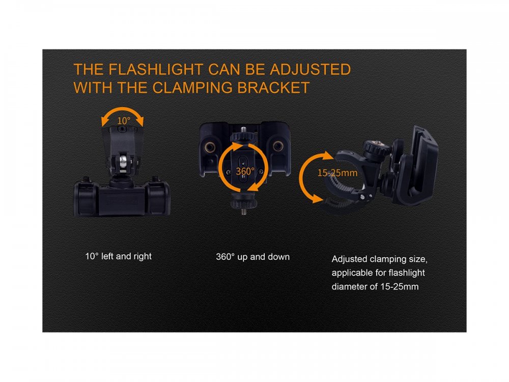 También se puede usar solo para montar su linterna en un casco, con el soporte de sujeción con un rango de movimiento de 10 ° de izquierda a derecha y de 360 ​​° hacia arriba y hacia abajo, puede colocar fácilmente la luz donde más la necesita. Con una abrazadera ajustable, este soporte puede montar linternas con un diámetro de 15-25 mm en su casco.