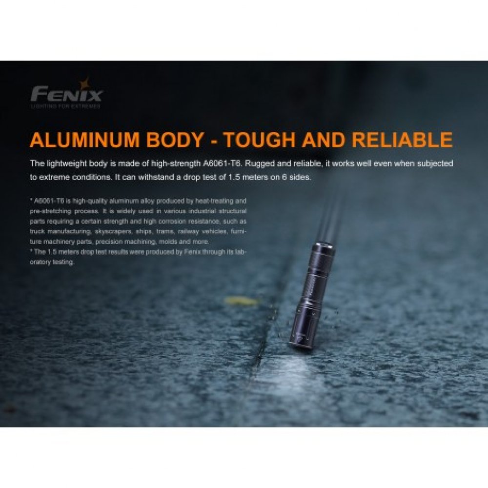 Linterna Fenix E01 V2.0 es una mini linterna llavero con un tamaño y peso insignificantes. Con la batería (desechable) AAA incluida, emite una potencia impresionante de hasta 100 lúmenes. La luz es bastante duradera con un cuerpo ligero de mecanizado CNC totalmente metálico, un acabado anti-abrasivo anodizado duro tipo HAIII de primera calidad y una excelente capacidad de impermeabilidad. El tamaño pequeño, y el conveniente interruptor giratorio y los 3 niveles de potencia flexibles hacen de la E01 la respuesta al transporte diario. La linterna ultra compacta Fénix E01 V2.0 se puede llevar junto con sus llaves para que siempre tenga una luz confiable y brillante en cualquier momento y en cualquier lugar. - Disponible solo en color NEGRO - Utiliza LED Cree XP-G2 S3 con una vida útil de 50.000 horas.el manejo con una mano con el interruptor giratorio. Cuerpo ligero de mecanizado CNC totalmente metálico.Tamaño: 66,5 x 15 x 14 mm - Peso: 13 g (sin batería) Los parámetros mencionados en las fotos fueron testeados con baterías AAA de alta calidad. Estos parámetros pueden tener variaciones entre partidas de linternas, baterías y medio ambiente.