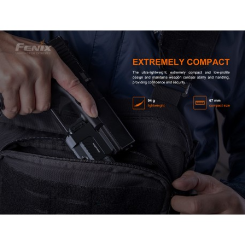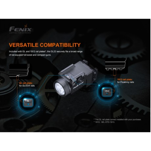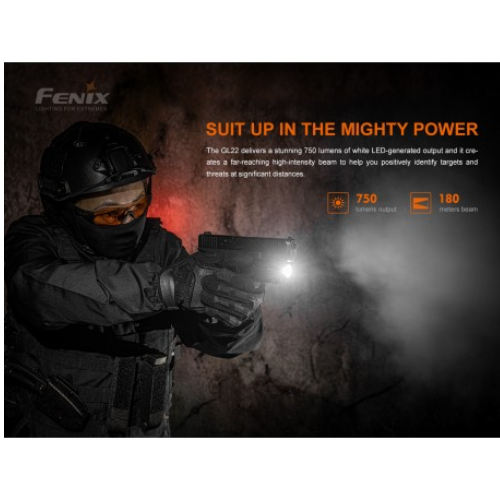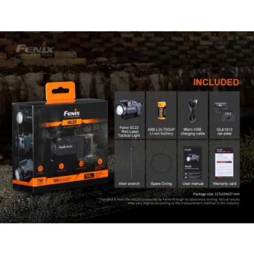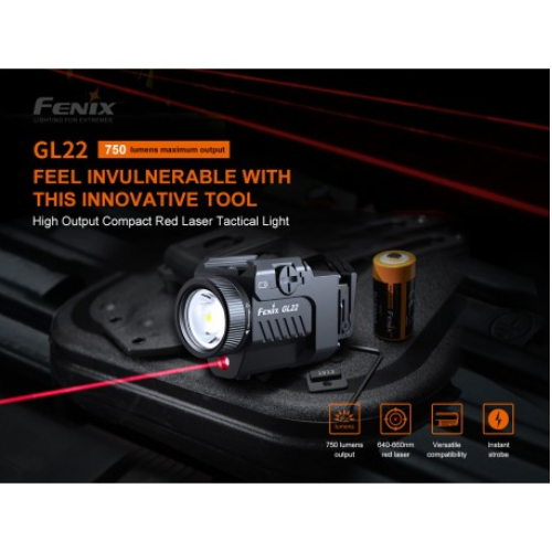 La luz táctica láser roja Fenix GL22 de alto rendimiento, es una combinación compacta de luz blanca y láser rojo, que integra una amplia compatibilidad y una gran precisión. El láser rojo es muy visible para los ojos humanos, lo que ayuda al usuario a alcanzar el objetivo de forma rápida y precisa. Su luz blanca LED a prueba de retroceso emite una salida máxima de 750 lúmenes y una distancia de haz robusta de 180 metros. Se puede acoplar de forma segura a los rieles de accesorios Universal y Picatinny, lo que mejora la visibilidad y la capacidad de orientación en las fuerzas del orden y tiro deportivo.