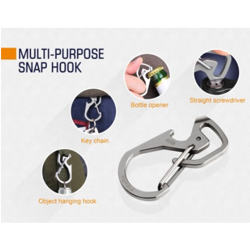Con las tres funciones adicionales: un gancho para colgar, un abrebotellas y un destornillador recto, este gancho seguro de presión multipropósito está hecho para ser más útil y fácil de transportar. La aleación de titanio TC4 (ampliamente utilizada en la aviación, la construcción naval y las industrias médicas) presenta una alta resistencia a la tracción. Resistencia y dureza, extraordinaria resistencia a la corrosión y ligereza. El cual tambien puede usar como llavero.-