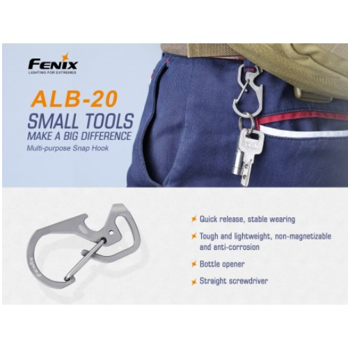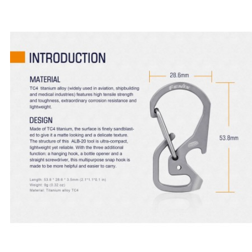 Este Mosqueton ALB-20 de Fenix, esta fabricado en itanio TC4, la superficie está pulida finamente con chorro de arena, para darle un aspecto mate y una textura delicada.