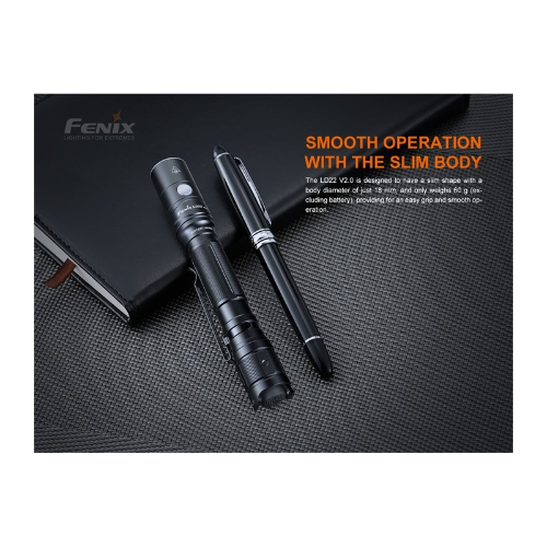 Linterna Fenix LD22 V2.0 mejorada es una linterna multipropósito para exteriores que sigue siendo compacta y ofrece una potencia más alta, de 800 lúmenes y una distancia de haz más lejana de 214 metros. Incluye un paquete de baterías de iones de litio recargables de 1100 mAh y puede ser usada con baterías AA de fácil acceso. Cinco niveles de potencia más Strobe y SOS son operados por separado por el interruptor trasero táctico y el interruptor lateral funcional. Además, con su clip para el cuerpo de dos posiciones, puedes llevarlo como quieras.