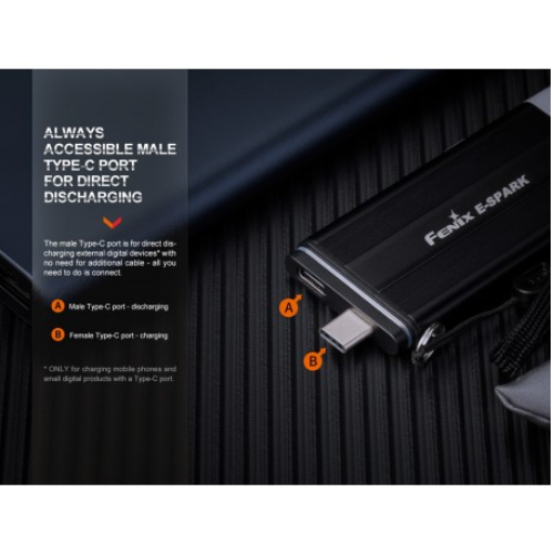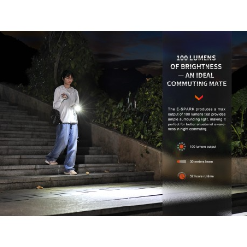 La Fenix E-SPARK es una linterna de llavero recargable con función de power bank. Con la batería incorporada de 800 mAh, produce una potencia máxima de 100 lúmenes. Recargue oportunamente la luz a través del puerto de carga USB tipo C cuando necesite una iluminación constante, y esta luz es capaz de cargar su teléfono móvil en caso de emergencia. La luz roja funcional y el parpadeo rojo son perfectos para la señalización. Mantenga esta luz en sus llaves, en un bolsillo o en un cajón para tener siempre una linterna al alcance de su mano. Confíe en esta luz de llavero para sus necesidades diarias.