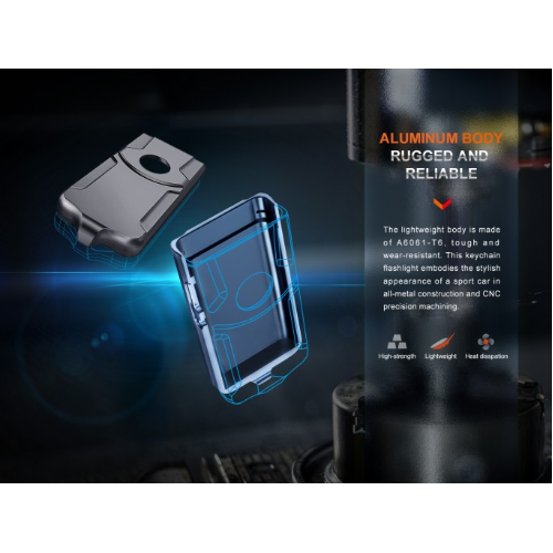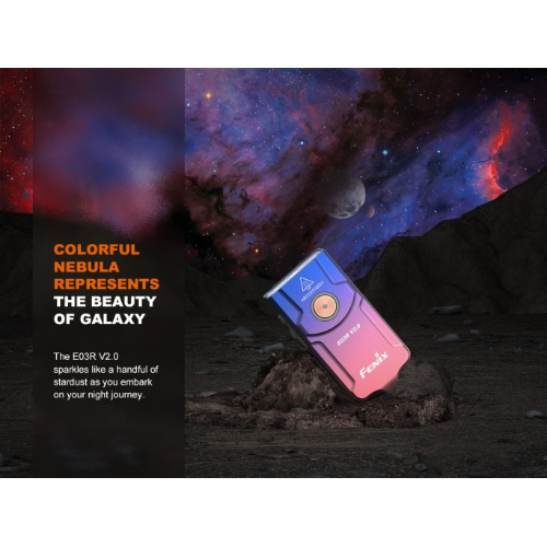 Edition Limited de linterna de llavero Fenix E03R, en color "Nebula" Mecanizado a partir de CNC de metal completo de alrededor de 2'' de largo, tiene el tamaño EDC perfecto. Es resistente con una clasificación IP66 a prueba de salpicaduras y polvo. El E03R V2.0 que la puede usar como llavero,sería un gran regalo para sus seres queridos. Sorprendentemente brillante para su pequeño tamaño