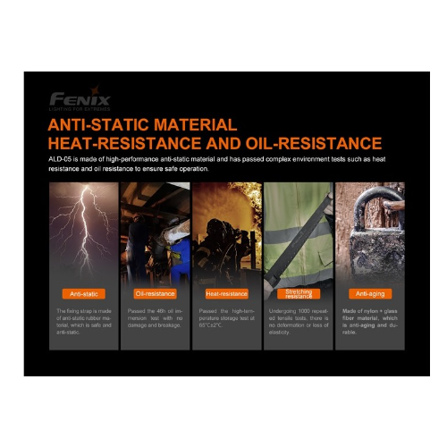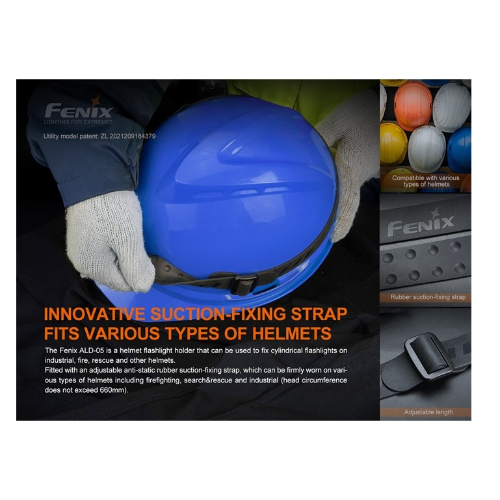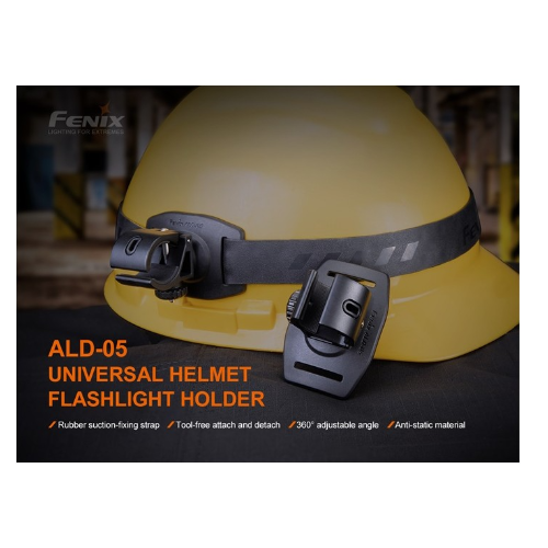 El Fenix ALD-05 es un soporte para linterna para casco que se puede utilizar para fijar linternas cilíndricas en cascos industriales, de bomberos, de rescate y otros. Equipado con una correa de fijación de goma antiestática ajustable, que se puede usar firmemente en varios tipos de cascos (la circunferencia de la cabeza no supera los 660 mm). El soporte de la linterna se puede girar 360 grados, lo que resulta conveniente para ajustar el ángulo de iluminación de la linterna hacia arriba y hacia abajo. Calibre de sujeción ajustable: adecuado para linternas con un diámetro exterior del cuerpo de 20-28 mm.
