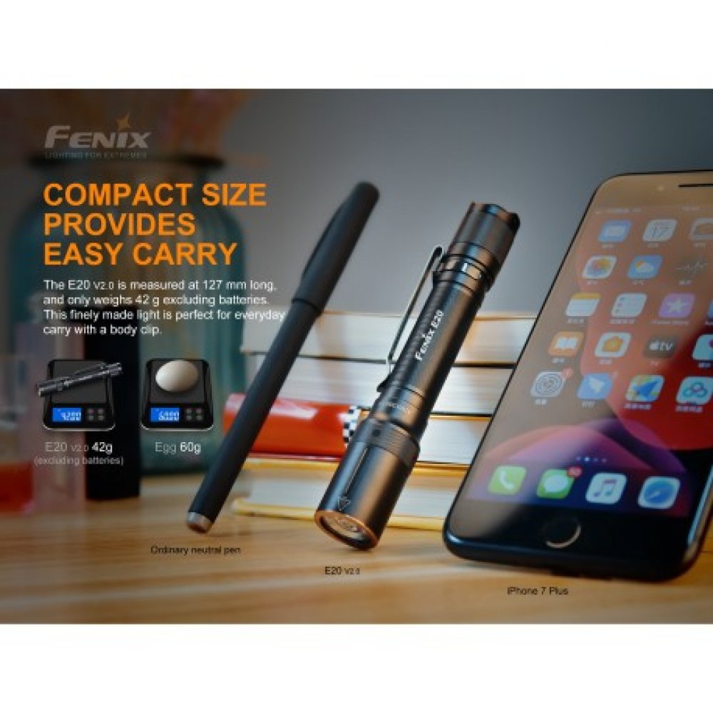 Linterna Fenix E20 V2.0 es una linterna EDC portátil. Con una selección de potencia que se logra con una mano a través del interruptor de cola única. Tiene un solo LED Luminus SST20,con una vida útil de 50.000 horas. que ofrece una potencia máxima de 350 lúmenes y una distancia máxima de alumbrado a 126 metros. La linterna viene con dos baterías AA desechables y las baterías se pueden reemplazar por recargables. Sus características adicionales : 4 potencias de alumbrado , circuito regulado digitalmente y protección con clasificación IP68. La linterna es versátil en actividades al aire libre y en la vida diaria. - Funciona con 2 pilas AA (Ni-MH alcalinas). - Circuito regulado digitalmente para mantener una salida estable. - Protección inteligente contra sobrecalentamiento contra altas temperaturas superficiales. - Protección de polaridad inversa, para proteger de la inserción incorrecta de la batería. - Operación con una mano con el interruptor trasero de marcha atrás. - Fabricado en aluminio A6061-T6. - Acabado antiabrasivo anodizado duro tipo HAIII de primera calidad. - Proceso de recubrimiento de lentes ópticas ultradelgadas patentadas para automóviles. - Tamaño: 127 x 21 x 16,8 mm / - Peso:42 g (sin batería).
