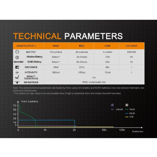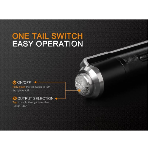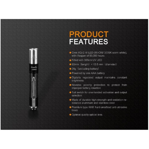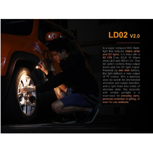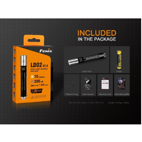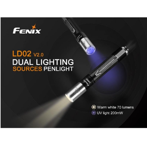 Linterna Fénix LD02 Versión 2.0, tiene Luz UV y luz blanco, con sus 70 lúmenes permiten un alcance lumínico de hasta 48 metros de distancia. Su autonomía es de 75 horas de duración con sólo una batería AAA en potencia baja. 3 potencias de iluminación mas Luz UV. INCLUYE pila alcalina, anillo para colgar y juego de o-rings de repuesto. LED Cree XQ-E blanco cálido de 90 CRI (hecho en USA) con vida de 50.000 horas de uso LED UV de 365 nm con 200 mW Usa 1 pila AAA de 1.5 V (Ni-MH, Alcalina) 92 mm (largo) x 13,5 mm (diámetro) 24 gramos, sin incluir la batería Luz regulada digitalmente, lo que hace que el nivel de luz sea siempre constante. Sistema de protección de polaridad inversa que previene daños del circuito.