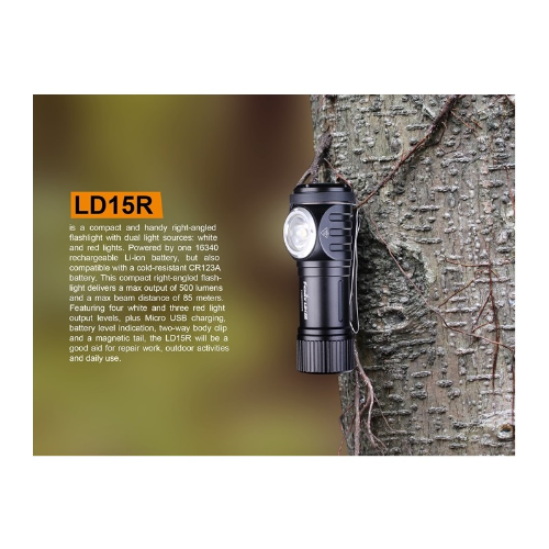 Linterna táctica Fénix LD 15 R, con hasta 500 lúmenes. Tiene un alcance de 85 metros de distancia y su autonomía alcanza hasta 110 horas de duración, con sólo una batería en potencia baja. 4 potencias de iluminación en luz blanca, más luz roja, intermitente y rojo SOS. Liviana, potente, fácil de llevar. Ideal para cada día. Dos años de garantía, como todas la Linternas Tácticas Fénix. . *INCLUYE PILA 16340 recargable *Incluye: Bolsa de tela para guardar, clip y juego de o-rings de repuesto. *LED Cree XP-G3 blanca (made in USA) con vida de 50.000 horas de uso 70 mm (largo) x 19 mm (diámetro) *40 gramos, sin incluir la batería Indicador de nivel de batería *Recargable por USB *Luz Roja de 1 lúmen *Luz regulada digitalmente, lo que hace que el nivel de luz sea siempre constante. *Clip para usar en ambos lados *Cola de la linterna con imán para ponerla en superficies metálicas *Protección de polaridad inversa.