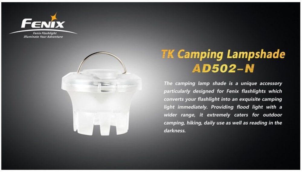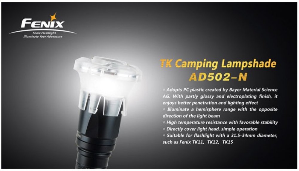 Lampara difusora en forma de pantalla modelo AD502-N para linternas TK es un accesorio único, diseñado para las linternas Fenix que convierten su potente luz en una lámpara de camping. Fabricada con plástico PC Compatible con linternas de dos tipos de diámetro de cabezal de 31,5 mm a 34 mm. como TK11, TK15