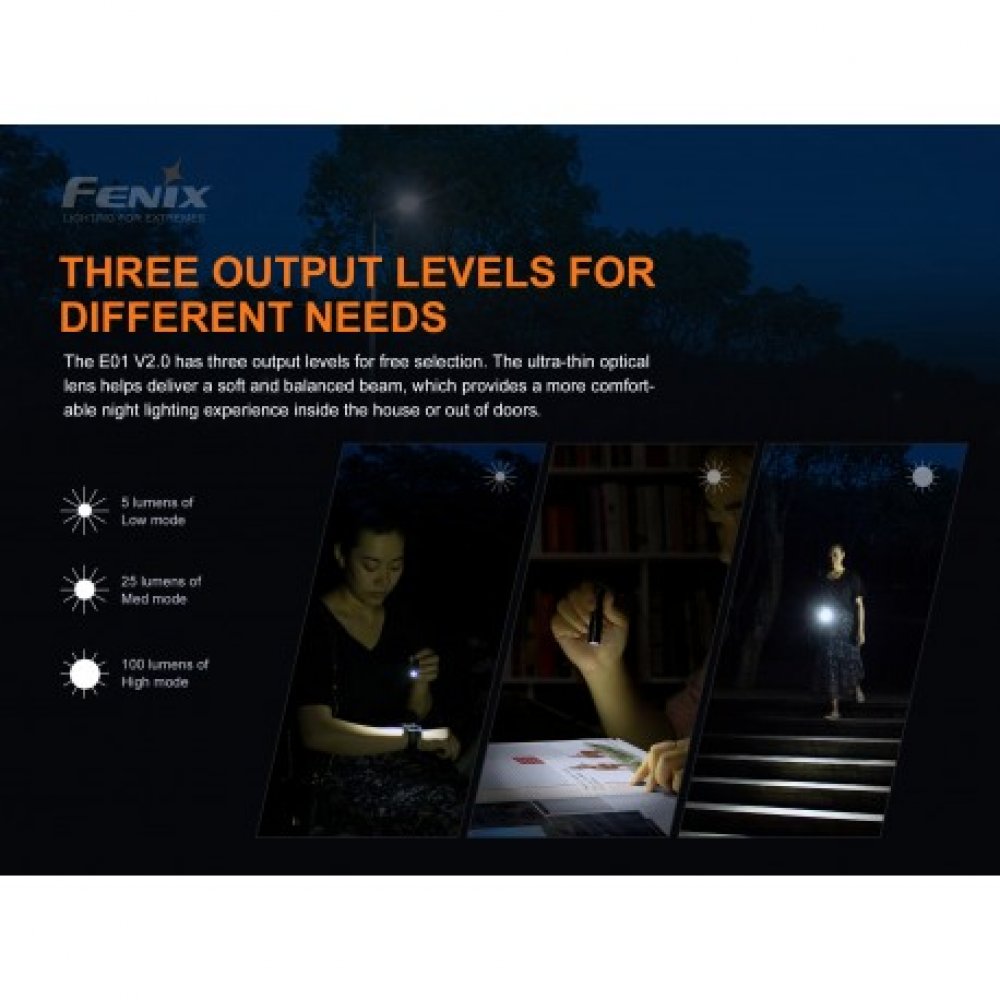 Linterna Fenix E01 V2.0 es una mini linterna llavero con un tamaño y peso insignificantes. Con la batería (desechable) AAA incluida, emite una potencia impresionante de hasta 100 lúmenes. La luz es bastante duradera con un cuerpo ligero de mecanizado CNC totalmente metálico, un acabado anti-abrasivo anodizado duro tipo HAIII de primera calidad y una excelente capacidad de impermeabilidad. El tamaño pequeño, y el conveniente interruptor giratorio y los 3 niveles de potencia flexibles hacen de la E01 la respuesta al transporte diario. La linterna ultra compacta Fénix E01 V2.0 se puede llevar junto con sus llaves para que siempre tenga una luz confiable y brillante en cualquier momento y en cualquier lugar. - Disponible solo en color NEGRO - Utiliza LED Cree XP-G2 S3 con una vida útil de 50.000 horas.el manejo con una mano con el interruptor giratorio. Cuerpo ligero de mecanizado CNC totalmente metálico.Tamaño: 66,5 x 15 x 14 mm - Peso: 13 g (sin batería) Los parámetros mencionados en las fotos fueron testeados con baterías AAA de alta calidad. Estos parámetros pueden tener variaciones entre partidas de linternas, baterías y medio ambiente.
