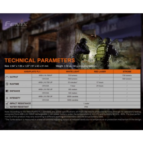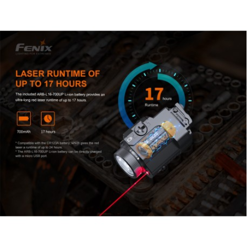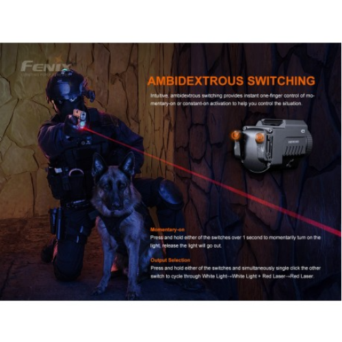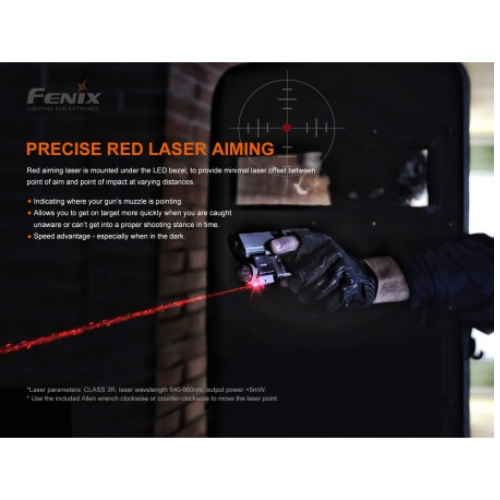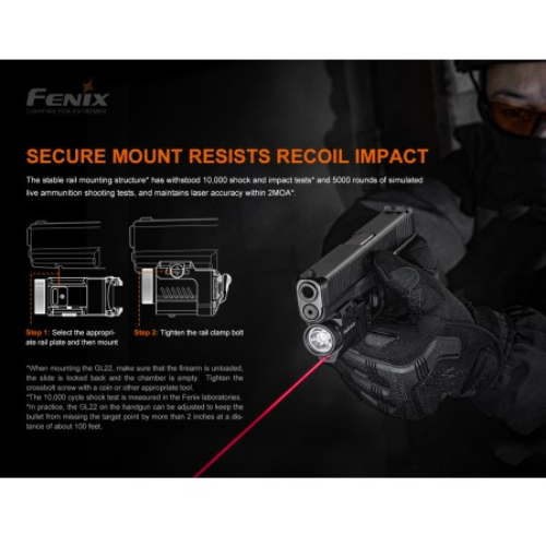 La luz táctica láser roja Fenix GL22 de alto rendimiento, es una combinación compacta de luz blanca y láser rojo, que integra una amplia compatibilidad y una gran precisión. El láser rojo es muy visible para los ojos humanos, lo que ayuda al usuario a alcanzar el objetivo de forma rápida y precisa. Su luz blanca LED a prueba de retroceso emite una salida máxima de 750 lúmenes y una distancia de haz robusta de 180 metros. Se puede acoplar de forma segura a los rieles de accesorios Universal y Picatinny, lo que mejora la visibilidad y la capacidad de orientación en las fuerzas del orden y tiro deportivo.