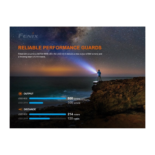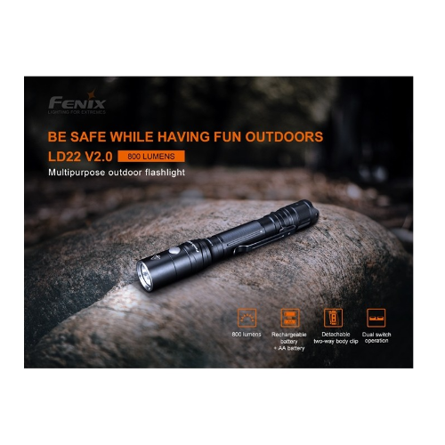 Linterna Fenix LD22 V2.0 mejorada es una linterna multipropósito para exteriores que sigue siendo compacta y ofrece una potencia más alta, de 800 lúmenes y una distancia de haz más lejana de 214 metros. Incluye un paquete de baterías de iones de litio recargables de 1100 mAh y puede ser usada con baterías AA de fácil acceso. Cinco niveles de potencia más Strobe y SOS son operados por separado por el interruptor trasero táctico y el interruptor lateral funcional. Además, con su clip para el cuerpo de dos posiciones, puedes llevarlo como quieras.
