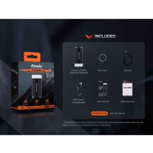 La Fenix E-SPARK es una linterna de llavero recargable con función de power bank. Con la batería incorporada de 800 mAh, produce una potencia máxima de 100 lúmenes. Recargue oportunamente la luz a través del puerto de carga USB tipo C cuando necesite una iluminación constante, y esta luz es capaz de cargar su teléfono móvil en caso de emergencia. La luz roja funcional y el parpadeo rojo son perfectos para la señalización. Mantenga esta luz en sus llaves, en un bolsillo o en un cajón para tener siempre una linterna al alcance de su mano. Confíe en esta luz de llavero para sus necesidades diarias.