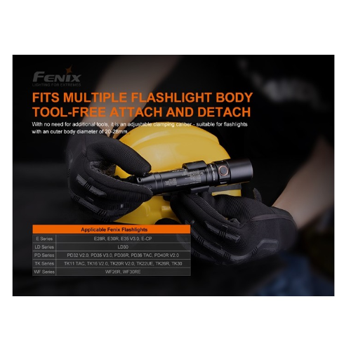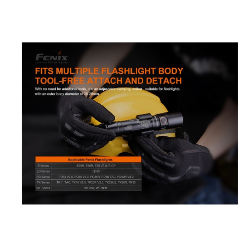 El Fenix ALD-05 es un soporte para linterna para casco que se puede utilizar para fijar linternas cilíndricas en cascos industriales, de bomberos, de rescate y otros. Equipado con una correa de fijación de goma antiestática ajustable, que se puede usar firmemente en varios tipos de cascos (la circunferencia de la cabeza no supera los 660 mm). El soporte de la linterna se puede girar 360 grados, lo que resulta conveniente para ajustar el ángulo de iluminación de la linterna hacia arriba y hacia abajo. Calibre de sujeción ajustable: adecuado para linternas con un diámetro exterior del cuerpo de 20-28 mm.