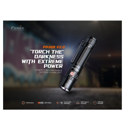 Linterna Marca Fenix Modelo PD36R V2.0 esta táctica recargable compacta. Esta euipada con un LED Luminus SFT40,que emite una salida máxima de 1700 lúmenes, con una impresionante distancia de haz de hasta 396 metros.