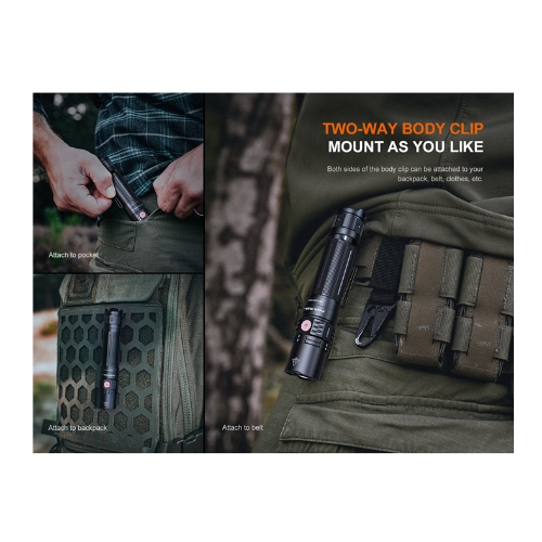 Manipular esta poderosa linterna LED recargable se hace simple con el interruptor táctico trasero para funciones de encendido/apagado momentáneo y constante, y el interruptor lateral montado en el cuello para selección de brillo y activación de la luz estroboscópica instantánea. Las características adicionales incluyen un clip corporal bidireccional, un indicador de nivel de batería y protección con clasificación IP68. Diseñado para actividades al aire libre, militares y fuerzas del orden.