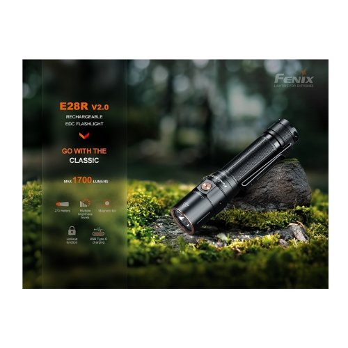 Linterna Fenix ​​Modelo E28R V2.0, recargable muy esperada por los amantes de la EDC. Incluye  una batería de 3400 mAh,con una máxima de salida de 1700 lúmenes y una distancia máxima del haz de 273 metros.