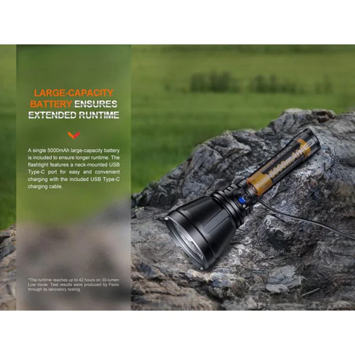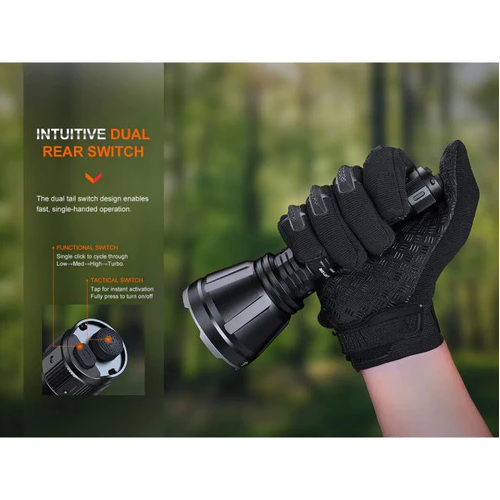 Su protección con clasificación IP68 permite que esta linterna funcione en condiciones climáticas adversas. Sus características adicionales incluyen el interruptor trasero táctico y el puerto de carga USB tipo C incorporado. Con todas estas ventajas, seguramente será su ayudante confiable en la iluminación de larga distancia, como caza y búsqueda.