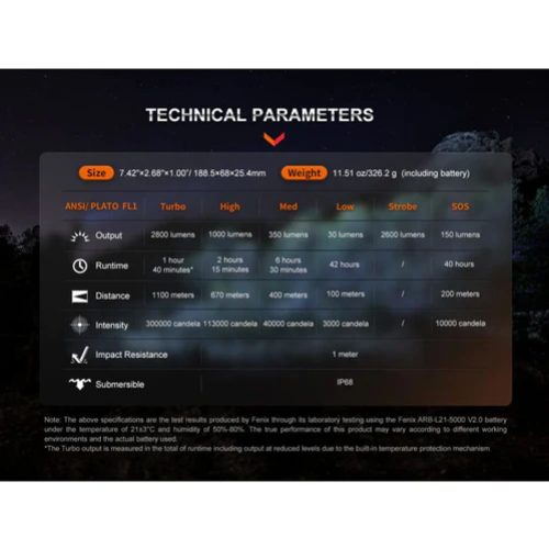 Esta linterna destaca por su sorprendente haz de luz de larga distancia de 1100 metros y su potente salida de hasta 2800 lúmenes, lo que proporciona una excelente visión en distancias muy largas.