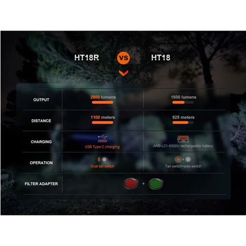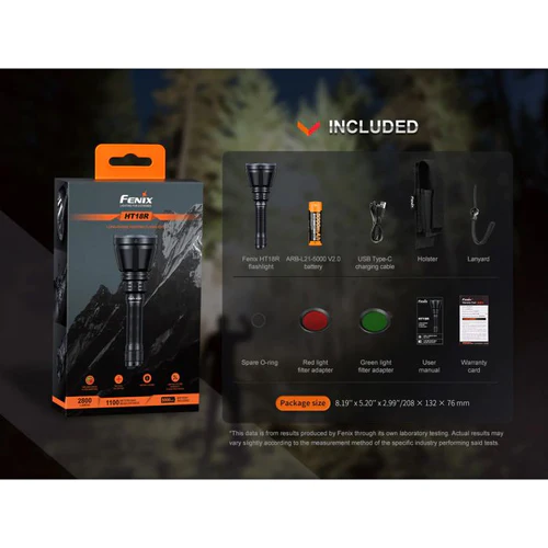 Linterna Marca Fenix Modelo HT18R, recargable está especialmente diseñado para iluminación de caza. Incluye batería de gran capacidad de 5000 mAh.