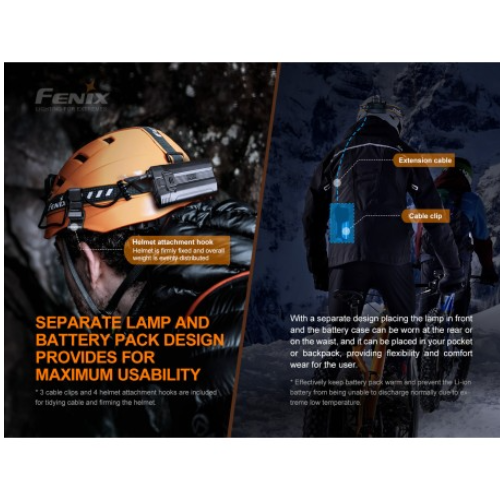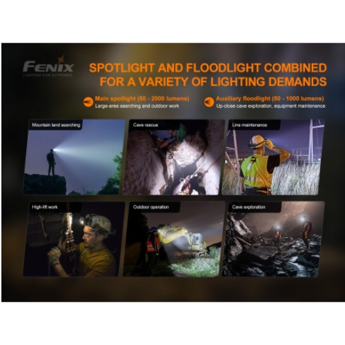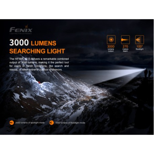 La versión mejorada Fenix HP30R V2.0 es una linterna frontal independiente recargable de alto rendimiento. La energía proviene de las dos baterías recargables 21700 incluidas que permiten un tiempo de funcionamiento prolongado en un estuche fácil de recargar con la capacidad única de cargar también sus otros dispositivos digitales como un banco de energía. Los 3 LED únicos se pueden usar a la vez para dispersar unos increíbles 3000 lúmenes que alcanzan más de 270 metros. La versatilidad de esta linterna frontal comienza con la caja de la batería que se lleva con el cinturón que permite un diseño liviano y cómodo en la cabeza. La capacidad única de utilizar niveles de inundación y puntuales a la vez le proporciona una luz adaptable. El HP30R V2.0 puede ser una herramienta que salva vidas para los profesionales de búsqueda y rescate.
