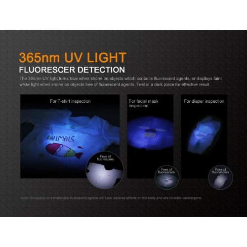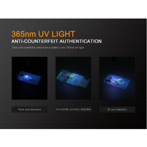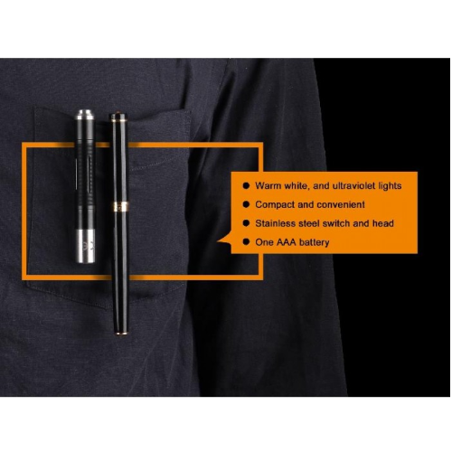 Linterna Fénix LD02 Versión 2.0, tiene Luz UV y luz blanco, con sus 70 lúmenes permiten un alcance lumínico de hasta 48 metros de distancia. Su autonomía es de 75 horas de duración con sólo una batería AAA en potencia baja. 3 potencias de iluminación mas Luz UV. INCLUYE pila alcalina, anillo para colgar y juego de o-rings de repuesto. LED Cree XQ-E blanco cálido de 90 CRI (hecho en USA) con vida de 50.000 horas de uso LED UV de 365 nm con 200 mW Usa 1 pila AAA de 1.5 V (Ni-MH, Alcalina) 92 mm (largo) x 13,5 mm (diámetro) 24 gramos, sin incluir la batería Luz regulada digitalmente, lo que hace que el nivel de luz sea siempre constante. Sistema de protección de polaridad inversa que previene daños del circuito.