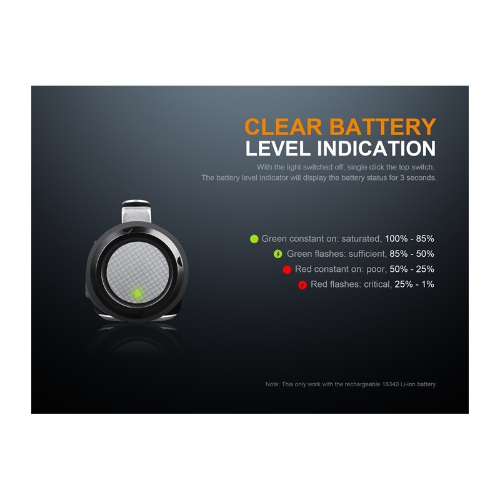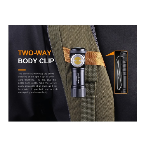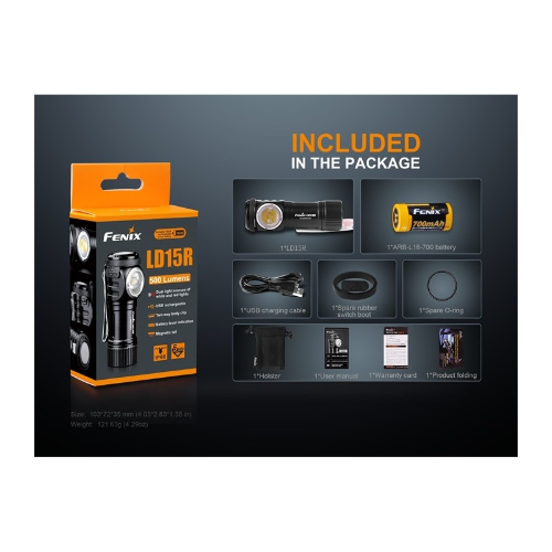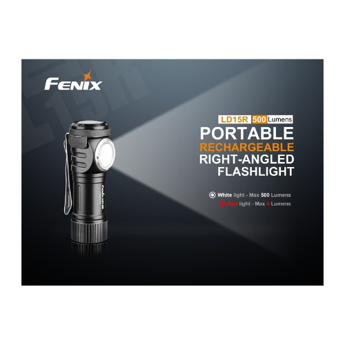 Linterna táctica Fénix LD 15 R, con hasta 500 lúmenes. Tiene un alcance de 85 metros de distancia y su autonomía alcanza hasta 110 horas de duración, con sólo una batería en potencia baja. 4 potencias de iluminación en luz blanca, más luz roja, intermitente y rojo SOS. Liviana, potente, fácil de llevar. Ideal para cada día. Dos años de garantía, como todas la Linternas Tácticas Fénix. . *INCLUYE PILA 16340 recargable *Incluye: Bolsa de tela para guardar, clip y juego de o-rings de repuesto. *LED Cree XP-G3 blanca (made in USA) con vida de 50.000 horas de uso 70 mm (largo) x 19 mm (diámetro) *40 gramos, sin incluir la batería Indicador de nivel de batería *Recargable por USB *Luz Roja de 1 lúmen *Luz regulada digitalmente, lo que hace que el nivel de luz sea siempre constante. *Clip para usar en ambos lados *Cola de la linterna con imán para ponerla en superficies metálicas *Protección de polaridad inversa.